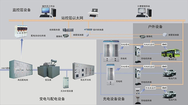 充電樁系統(tǒng)是由變電與配電設(shè)備系統(tǒng),充電設(shè)備系統(tǒng),戶外設(shè)備系統(tǒng),監(jiān)控層設(shè)備系統(tǒng)5大系統(tǒng)構(gòu)成。電網(wǎng)傳輸過來的高壓電壓通過高壓配電和變壓器降壓為低壓電壓,經(jīng)過低壓開關(guān)傳輸?shù)匠潆姌?,再由充電柜將電流整流,濾波,放大,讓電壓和電流達(dá)到了要求值。