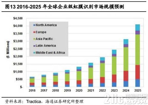 從終端市場(chǎng)來看,據(jù)數(shù)據(jù)顯示,2016 年全球企業(yè)級(jí)虹膜識(shí)別終端出貨量1070萬臺(tái),預(yù)計(jì)到2025年出貨量將達(dá)到6160萬臺(tái),復(fù)合年均增速為19.1%,對(duì)應(yīng)市場(chǎng)規(guī)模將從2016年的6.77億美元增長(zhǎng)至2025年的41億美元,復(fù)合年均增速19.7%。其中,2020年市場(chǎng)規(guī)模約為13.5億美元。