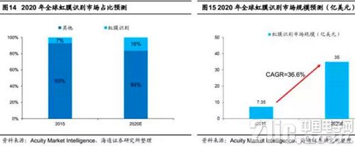 根據(jù)美國(guó)智庫(kù)Acuity Market Intelligence的報(bào)告顯示,虹膜識(shí)別在手機(jī)、平板電腦等消費(fèi)級(jí)終端市場(chǎng)規(guī)模將增長(zhǎng)的更快。預(yù)計(jì) 2020年全球生物識(shí)別市場(chǎng)將達(dá)到 218.7億美元,其中虹膜識(shí)別技術(shù)占全球生物特征識(shí)別的市場(chǎng)份額,將從2015年的7%提升至2020年的16%,2020年的總產(chǎn)值將達(dá)到35億美元,對(duì)應(yīng)復(fù)合年均增速為36.6%。